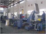 編織袋母粒造粒機組:高速混合機-----加壓式密煉機-----提升機-----錐雙強制喂料機-----單螺桿主機-----風冷模面熱切機頭-----旋風分離器-----加長風冷振動篩-----成品料倉
