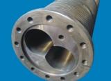 技術(shù)指標(biāo):38CrMoAIA,氮化處理,表面硬度:HV≥900,氮化層深度:0.5-0.8mm,表面鍍鉻硬度≥1000HV,鉻層厚度0.01-0.10mm,雙合金硬度HRC60-70,雙合金層深度>2mm.螺棱表面采用雙合金燒焊,有效的提高螺桿的使用壽命。料口易磨損部分采用進(jìn)口合金鋼材,經(jīng)過(guò)特殊處理,能有效提高機(jī)筒耳朵耐磨性,提高使用壽命。